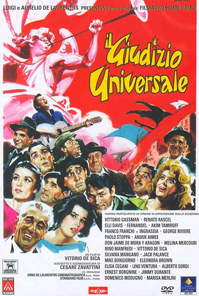Il giudizio universale (O juízo universal). Direção: Vittorio De Sica. Produção: Dino De Laurentiis. Roteiro: Cesare Zavattini. Elenco: Alberto Sordi, Vittorio Gassman, Anouk Aimée, Fernandel, Nino Manfredi e outros.