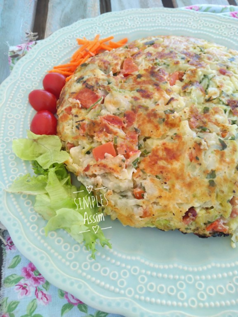 - Numa tigela, junte repolho, cebola, queijo, tomate, ovo batido, temperos, azeite, leite e requeijão.