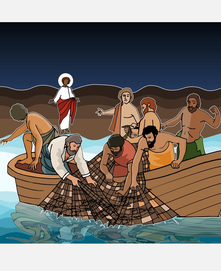 Depois disso Jesus apareceu novamente aos seus discípulos, à margem do mar de Tiberíades. Foi assim: Estavam juntos Simão Pedro; Tomé, chamado Dídimo; Natanael, de Caná da Galileia; os filhos de Zebedeu; e dois outros discípulos. “Vou pescar”, disse-lhes Simão Pedro. E eles disseram: “Nós vamos com você”. Eles foram e entraram no barco, mas naquela noite não pegaram nada. Ao amanhecer, Jesus estava na praia, mas os discípulos não o reconheceram. Ele lhes perguntou: “Filhos, vocês têm algo para comer?” “Não”, responderam eles. Ele disse: “Lancem a rede do lado direito do barco e vocês encontrarão”. Eles a lançaram, e não conseguiam recolher a rede, tal era a quantidade de peixes. O discípulo a quem Jesus amava disse a Pedro: “É o Senhor!” Simão Pedro, ouvindo-o dizer isso, vestiu a capa, pois a havia tirado, e lançou-se ao mar. Os outros discípulos vieram no barco, arrastando a rede cheia de peixes, pois estavam apenas a cerca de noventa metros da praia. Quando desembarcaram, viram ali uma fogueira, peixe sobre brasas, e um pouco de pão. Disse-lhes Jesus: “Tragam alguns dos peixes que acabaram de pescar”. Simão Pedro entrou no barco e arrastou a rede para a praia. Ela estava cheia: tinha cento e cinquenta e três grandes peixes. Embora houvesse tantos peixes, a rede não se rompeu. Jesus lhes disse: “Venham comer”. Nenhum dos discípulos tinha coragem de lhe perguntar: “Quem és tu?” Sabiam que era o Senhor. Jesus aproximou-se, tomou o pão e o deu a eles, fazendo o mesmo com o peixe. Esta foi a terceira vez que Jesus apareceu aos seus discípulos, depois que ressuscitou dos mortos.